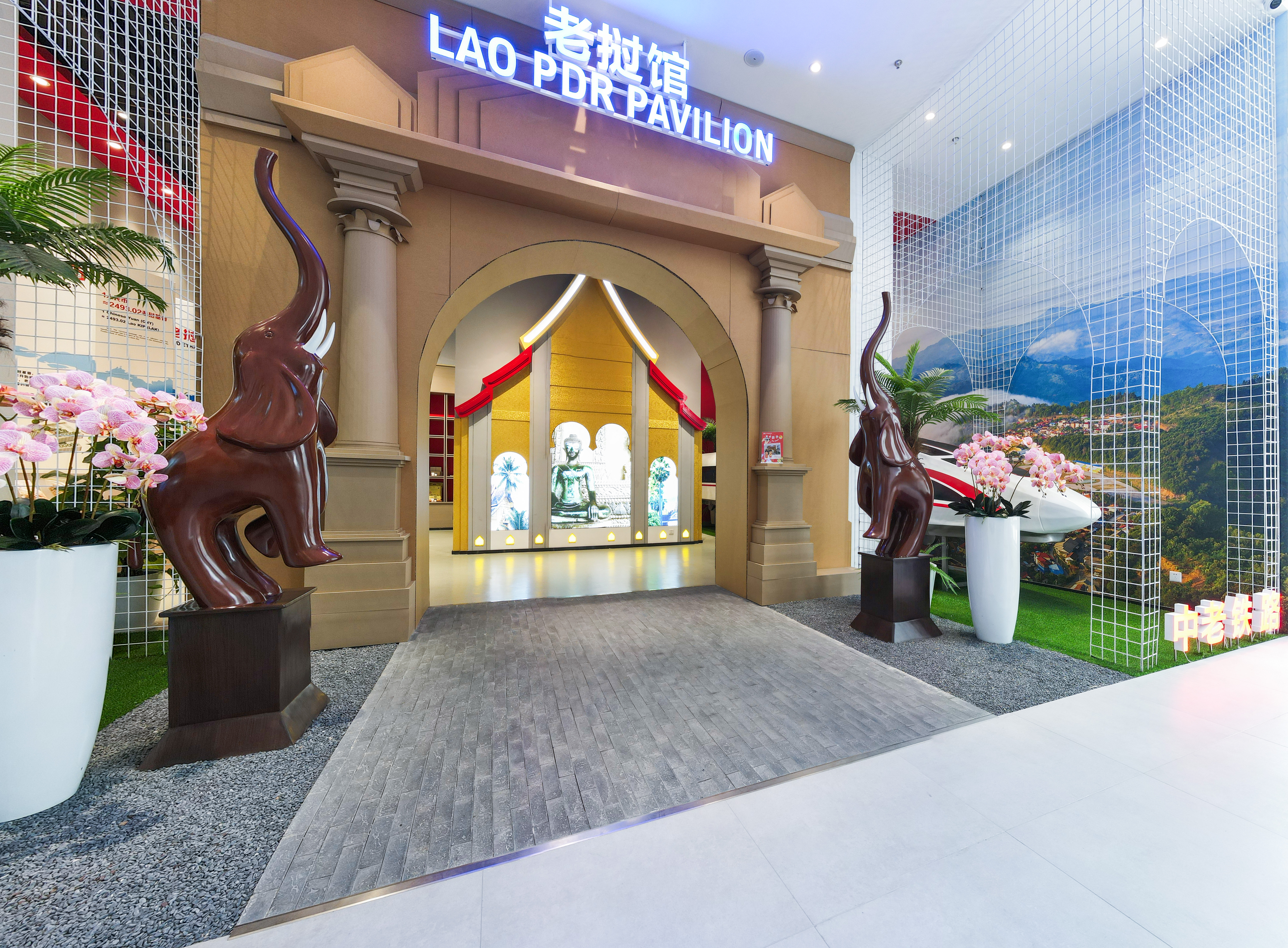 來到老撾館,考察團(tuán)立即被醒目的、象征中老友誼的“中老鐵路”所吸引。入口處兩尊工藝精湛、栩栩如生的大象木雕,以及仿照老撾凱旋門廣場精心設(shè)計(jì)的門頭造型,都令考察團(tuán)成員仿佛置身老撾。當(dāng)?shù)弥蠐氲钠【啤⒉枞~等特色商品通過匯聚中心線上線下平臺(tái)受到了越來越多的消費(fèi)者青睞時(shí),希帕占·南塔馮薩副主席深表感謝,也非常感動(dòng)在中國還有如此創(chuàng)意且專為老撾商家進(jìn)行商品展銷的展館,為老撾商家創(chuàng)造了無限商機(jī),讓更多的人通過匯聚中心知道老撾、了解老撾進(jìn)而走進(jìn)老撾,也成為促進(jìn)中老雙邊經(jīng)貿(mào)往來的重要窗口!
