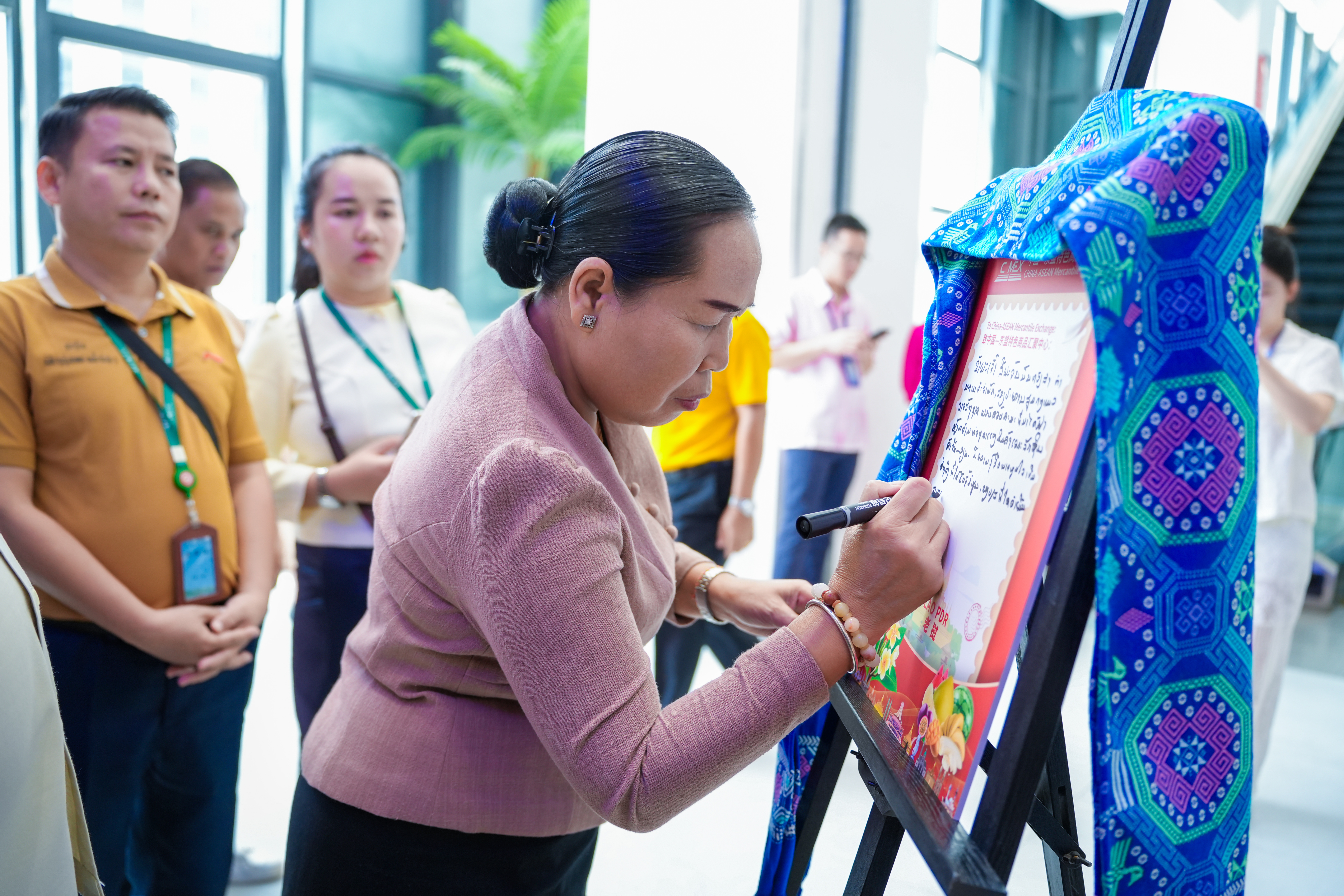 希帕占·南塔馮薩副主席在老撾館寫下了對匯聚中心的寄語,期待未來有更多的老撾特色商品進(jìn)駐匯聚中心,并祝項(xiàng)目越來越好。