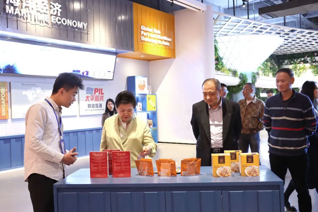 位于園區(qū)內(nèi)的中國—東盟特色商品匯聚中心,是中新南寧國際物流園與中國—東盟博覽會(huì)秘書處聯(lián)合重點(diǎn)打造的項(xiàng)目,致力于搭建中國與東盟、RCEP其他區(qū)域國家乃至“一帶一路”沿線重要國家經(jīng)貿(mào)往來線上線下一站式首選平臺(tái)。在參觀匯聚中心的過程中,考察團(tuán)聽取了展館的設(shè)計(jì)理念,對(duì)館內(nèi)琳瑯滿目的特色商品表現(xiàn)出濃厚的興趣。認(rèn)為匯聚中心線下展館不僅設(shè)計(jì)別出心裁,而且能夠通過線上平臺(tái)一站式購買各式東盟乃至RCEP其他區(qū)域國家的特色商品,比如新加坡的肉骨茶、泰國的醬料、澳大利亞的紅酒等,對(duì)商家及消費(fèi)者來說將是一種全新的沉浸式商貿(mào)體驗(yàn),同時(shí)匯聚中心提供的商品免費(fèi)展示空間,能夠降低入駐商家的運(yùn)營成本,為企業(yè)提供了良好的服務(wù)平臺(tái)。