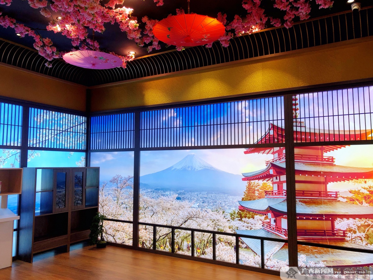 “我們現(xiàn)在看到的是‘春之色’部分,以最具有日本代表性的富士山與櫻花元素為春季設計核心,造型意向來自日本京都琉璃光院,讓人仿佛置身于一個與富士山隔空眺望的禪院。接下來,這里是‘夏之聲’部分,里面包含了許多日本動漫元素,其中不乏我們熟知的宮崎駿、手冢治蟲等大師的作品展示,‘秋之韻’部分融合了日本秋天的楓葉美景;‘冬之盼’部分主要體現(xiàn)的是日本高科技技術”中國—東盟特色商品匯聚中心招商部RCEP區(qū)域高級經(jīng)理梁曉婷介紹道。